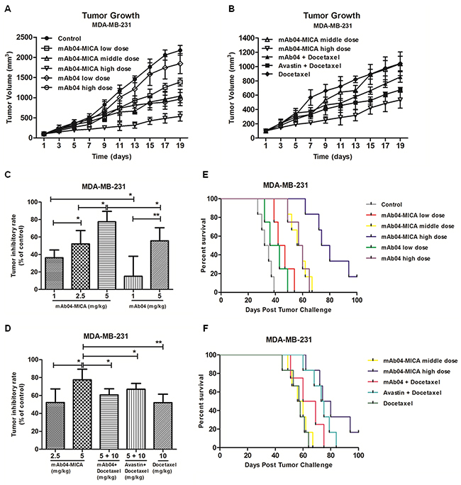 Figure 9: mAb04-MICA demonstrated in vivo efficacy against a MDA-MB-231 xenograft. A, B. Tumor growth curves for nude mice. Each BALB/c nude mouse was subcutaneously injected 1×107 MDA-MB-231 cells for different treatment. Treatment began following tumor development, and the measurement of tumor volume started as well. C, D. Tumor inhibition rates of different dosage groups. mAb04-MICA significantly improved tumor inhibition rate compared to mAb04/Docetaxel. Data were presented as the mean ± SD, *p < 0.05, **p < 0.01. E, F. Survival curves for nude mice bearing tumor. mAb04-MICA had noteworthy survival benefit compared to mAb04 + Docetaxel or Avastin + Docetaxel.