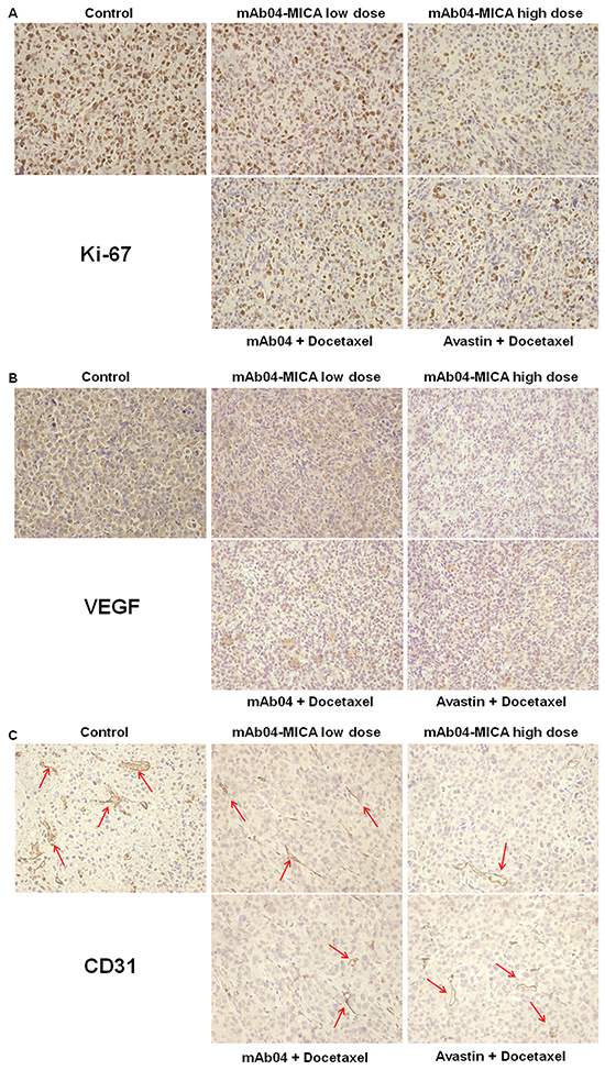 Tumor sections stained with anti-VEGF (Figure 10B) and anti-CD31 (Figure 10C) antibodies showed reduced intensity of staining in the mAb04-MICA treated groups. The density of tumor neovascularization was lower in the mAb04-MICA (5 mg/kg) treated group than mAb04 + Docetaxel or Avastin + Docetaxel group. The enhanced inhibition of Ki-67/VEGF/CD31 by mAb04-MICA were consistent with increased anti-tumor effects resulting from the presence of MICA.