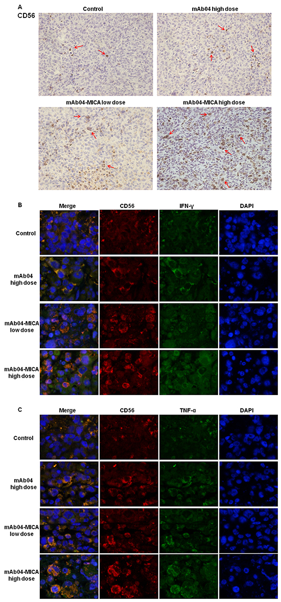 Figure 11: mAb04-MICA aggravated soakage of NK cells in MDA-MB-231 tumor tissue and increased the production of IFN-γ and TNF-α by NK cells. A. Infiltrated CD56+ cells were detected by IHC staining (brown staining, indicated by the red arrows) on serial sections, demonstrating more distribution of NK cells with mAb04-MICA treatment. B, C. IF double staining of CD56 (red fluorescence) and IFN-γ/TNF-α (green fluorescence) to determine the expression level of IFN-γ/TNF-α by NK cells. The orange staining cells after merged indicated the IFN-γ/TNF-α expressing NK cells, which increased with the increase of dose.