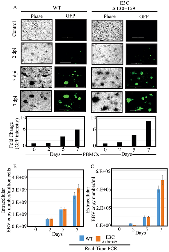 Figure 4: Comparisons of relative infectivity for BACEBV-GFPWT and EBVGFPΔE3C130-159 recombinant virus. A. PBMCs were infected by BACEBV-GFPWT (WT), and EBVGFPΔE3C130-159 (ΔE3C130-159) virus with equally loading. GFP expression was monitored under a fluorescent microscope after 2 dpi, 5 dpi and 7 dpi. B. Intracellular EBV virion progenies copies were measured by a real-time PCR with primers to EBNA1 at 2 dpi, 5 dpi and 7 dpi. C. Extracellular EBV virion progenies were analyzed by a real-time PCR with primers to EBNA1 at 2 dpi, 5 dpi, and 7 dpi. Dpi, days post infection.