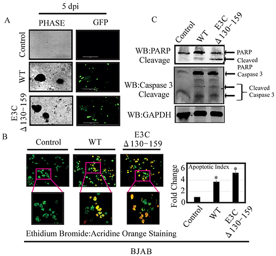 Figure 8: EBVGFPΔE3C130-159 virus infected cells can enhance induction of apoptosis. A. BJAB Cells infected with BACEBV-GFPWT (WT) and EBVGFPΔE3C130-159 (ΔE3C130-159) virus. GFP signal was monitored for the confirmation of infection. B. After 5 days p.i. cells were stained with a mixture of ethidium bromide and acridine orange. Fluorescence microscopy was used to analyze the cells. Pictures were captured through three channels, green, red, and yellow, which represent live cells, dead cells, and apoptotic cells respectively. For each slide, 10 fields (each containing 40 to 100 cells) were captured and counted. Experiments were performed 3 times. C. BJAB cells uninfected and infected with EBVGFPΔE3C130-159 virus cells compared to a BACEBV-GFPWT infection were evaluated for PARP1 and Caspase 3 cleavage along with GAPDH as control. *P<0.05; by Student’s t test compared to control.
