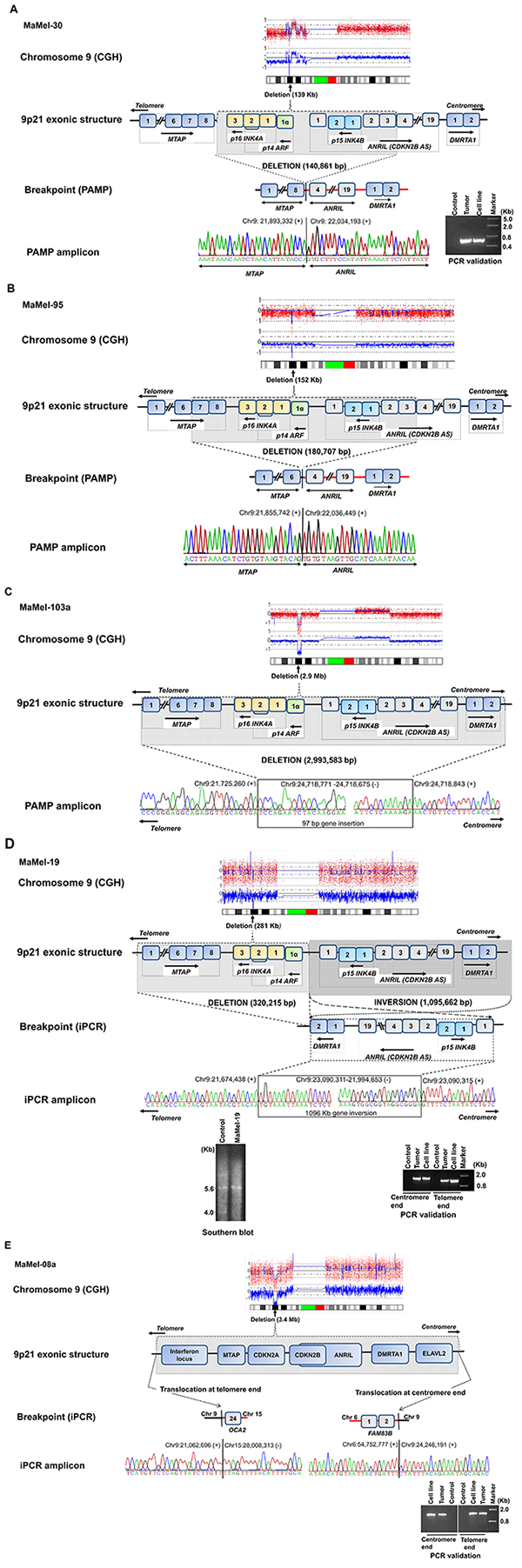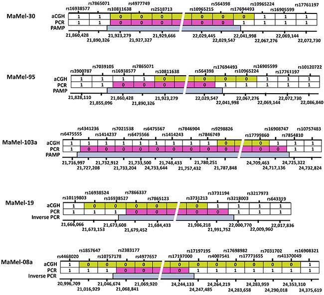 The pair wise copy-number data from 44 metastatic melanoma cell lines and corresponding peripheral blood mononuclear cells from a previous study was used to select cell lines with homozygous deletions (HD) [22]. 12 of the 44 cell lines carried HD at the 9p21 locus that ranged between 139 kb to 5.6 Mb (Supplementary Figure S1). Three cell lines (MaMel-30, MaMel-95, MaMel-19) with deletions less than 500 kb and two cell lines (MaMel-103a and MaMel-08a) with more than 2 Mb deletions were selected for mapping of breakpoints using primer approximation multiplex PCR (PAMP) or inverse PCR techniques (Supplementary Figure S2). The results from three cell lines, MaMel-30, MaMel-19 and MaMel-08a, were validated in the corresponding metastasized tumors; however, tumor tissues corresponding to MaMel-95 and MaMel-103a were not available.