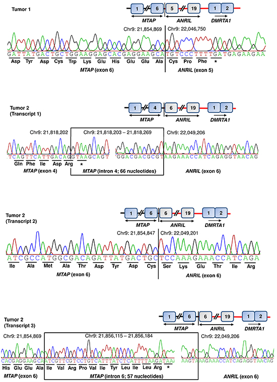 Figure 4: Detection of MTAP-ANRIL fusion transcripts in primary tumors. Tumor 1 showed one and tumor 2 showed three fusion transcripts. Two of the fusion transcripts (tumor 1 and tumor 2, transcript 2) involved exon 6 of MTAP; one transcript from tumor 2 (transcript 1) involved exon 4 of MTAP together with intron 4. One transcript from tumor 2 (transcript 3) involved exon 6 of MTAP together with intron 6. Three of the four transcripts involved exon 6 of ANRIL; whereas in tumor 1, the fusion transcript included exon 5 of ANRIL.
