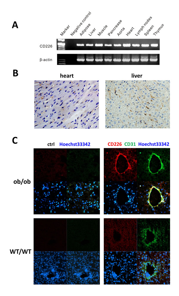 Figure 1: CD226 distribution in WT C57BL/6 mouse endothelial tissues. A. RT-PCR analysis. CD226 was expressed in immune tissues such as the lymph nodes, spleen, and thymus, in tissues involved in glucose metabolism, and in the cardiovascular system. The data shown represent 3 independent experiments. β-actin was the RT-PCR internal control. Negative control reactions were conducted without cDNA. B. Immunohistochemistry (IHC) staining of CD226 in normal mouse heart and liver. CD226 was detected in endothelial cells (original magnification, ×400), n = 3-5 for each group of mice. C. CD226 expression in liver sinusoidal endothelial cells, marked by CD31 staining, was higher in ob/ob mice (upper) than in WT mice (lower).