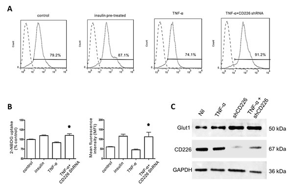 Figure 3: Effect of CD226 on 2-NBDG uptake in HUVECs. Cells were pre-incubated with 100 μM 2-NBDG for 30 min. Flow cytometry histogram of 20,000 cells. A. Representative flow cytometry analysis of 2-NBDG glucose uptake following different treatments. B. Glucose uptake expressed as percent of control and mean changes in 2-NBDG fluorescence intensity (MFI). Significant differences vs. the TNF-α group are indicated, * p < 0.05. C. Membrane expression of Glut1 increased after CD226 shRNA lentivirus infection with or without TNF-α treatment. Data are shown as the mean of three independent experiments.