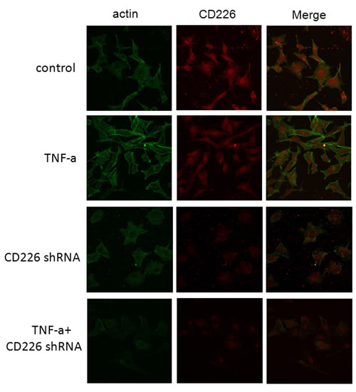Both high glucose and TNF-α impair endothelial barrier function and increase vascular permeability [14]. Rearrangement of filamentous actin (F-actin), the predominant cytoplasmic microfilament in non-muscle cells, is thought to be responsible for this altered permeability in HUVECs [4]. In morphologic studies using fluorescent staining of the actin cytoskeleton, we found that few stress fibers formed after 12 h exposure to high glucose. Stress fiber formation increased and F-actin was redistributed to the subcortical compartment after TNF-α was added. Pretreatment with human CD226 shRNA lentivirus reduced the redistribution of F-actin and formation of stress fibers under high glucose conditions both with and without 12 h of exposure to TNF-α (Figure 4).