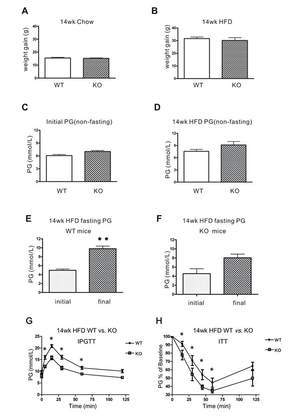 Figure 5: Glucose homeostasis in WT and CD226 KO mice after 14 weeks of high-fat diet (HFD). After 14 weeks of regular chow A. or high-fat diet B., body weight gains were measured in WT and CD226 KO mice. Non-fasting PG did not differ between C57BL/6 WT and CD226 KO mice before C. or after D. high-fat diet (WT vs. KO, p > 0.05, n = 6-8). E. Fasting PG in WT mice (initial vs. final, **p < 0.01, n = 6-8), F. fasting PG was higher in CD226 KO mice than in WT mice, but this difference was only marginally significant (p = 0.06, n = 6-8). G. Intraperitoneal injections of glucose in fasting HFD-fed WT (solid circles) and CD226 KO (hollow squares) mice led to lower glucose concentrations after 5, 15, 30, and 60 min. (*p < 0.05, **p < 0.01, n = 6-8). (H) The response of fasting HFD-fed WT (solid circles) and CD226 KO (hollow squares) mice following a single intraperitoneal injection of insulin (1.5 U/kg) was monitored by repeated blood glucose concentration measurements. Glucose concentrations were reduced more in HFD-fed CD226 KO mice than in HFD-fed WT mice after 15, 30, 45, 60 min (*p < 0.05, n = 6-8).