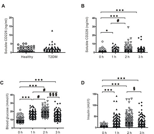 Figure 7: Plasma levels of soluble CD226 detected by ELISA. A. Fasting plasma levels of soluble CD226 in healthy controls (n = 50, hollow circles) and T2DM (n = 94, solid triangles) patients. B. Plasma levels of soluble CD226 from T2DM patients before (0 h, hollow circles) and 1 h (solid triangles), 2 h (inverted hollow triangles) and 3 h (solid diamonds) after an oral glucose tolerance test (OGTT). Results of the OGTT with time courses of blood glucose C. and insulin D. concentrations. Median values and interquartile ranges are shown. ***p < 0.001 vs. 0 h; #p < 0.05 vs. 1 h; §p < 0.05 vs. 2h; §§§p < 0.001 vs. 2 h.