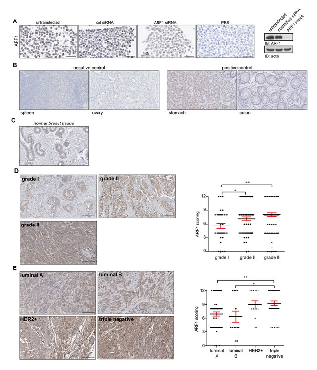 To examine levels of ARF1 expression in human cancer, we first used negative (spleen and ovary) and positive (stomach and colon) controls as predicted by the literature, and in accordance with the Human Protein Atlas [http://www.proteinatlas.org] [18]. As illustrated in Figure 1B, immunostaining conditions were satisfactorily established. Then, we controlled the labeling of ARF1 in normal breast tissue (Figure 1C). We next investigated ARF1 expression in human breast cancer tissue of various histological grades. We found a positive correlation between elevated levels of ARF1 and breast cancer of higher histological grades (Figure 1D). Finally, we examined the presence of ARF1 in a TMA comprising a variety of breast cancer tissues. Variations in the levels of ARF1 expression according to molecular subtypes of breast cancer were assessed. Although all subtypes were found to be positive for ARF1, samples collected from patients with luminal A and luminal B breast cancer had the lowest level of this ARF isoform. In sharp contrast, both HER2-positive and TNBC subtypes demonstrated higher levels of ARF1, even though only TNBC showed to be significantly different from luminal breast tissue (Figure 1E). We also examined levels of ARF6 proteins. First, expression of this ARF isoform was assessed in negative (heart muscle and skin dermis) and positive (colon and pancreas) controls in accordance with the Human Protein Atlas [http://www.proteinatlas.org] (Suppl Figure 1A). Next, we controlled the labeling of ARF6 in normal breast tissue (Suppl Figure 1B). As expected, we found a positive correlation between elevated levels of ARF6 and breast cancer of higher histological grades (Suppl Figure 1C). Surprisingly, we found that patients with HER2-positive breast cancer had the lowest level of this ARF isoform (Suppl Figure 1D). Luminal A, luminal B and TNBC subtypes demonstrated higher levels of ARF6. Interestingly, level of this ARF isoform was less pronounced than ARF1 in TNBC (Figure 1E and Suppl Figure 1D).