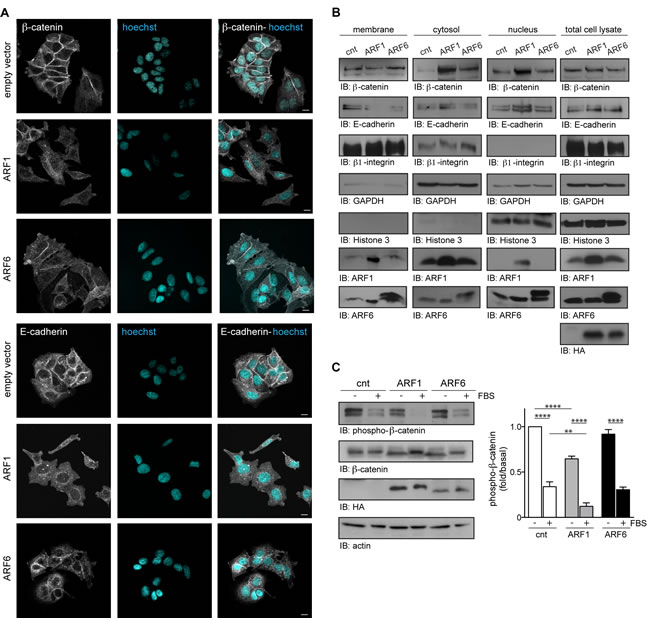 Figure 4: ARF1 is important for the maintenance of adherent junctions. A. MCF7 cells were transfected with empty vector (cnt), ARF1 or ARF6 and fixed after 48 hours. Cells were stained for β-catenin, E-cadherin and nuclei with Hoechst. Images are from three independent experiments, with more than 100 cells per condition. Scale bars, 10 μm. B. Cells transfected as in A. were used to prepare membrane fractions. Associated β-catenin, E-cadherin, ARF1 and ARF6 were assessed by Western blotting. These experiments are representative of three others. β1-Integrin was used as a plasma membrane marker, GAPDH as a cytosol marker and Histone 3 as nuclei marker. C. Cells transfected as in A. were stimulated with FBS (10%) for four hours. Endogenously expressed β-catenin, HA-tagged (hemagglutinin) proteins and actin were detected by Western blotting. Data are the mean ± SEM of four experiments. Statistical analysis was performed using a two-ways ANOVA followed by a Bonferroni’s multiple comparison test. **p < 0.01, ****p < 0.0001.