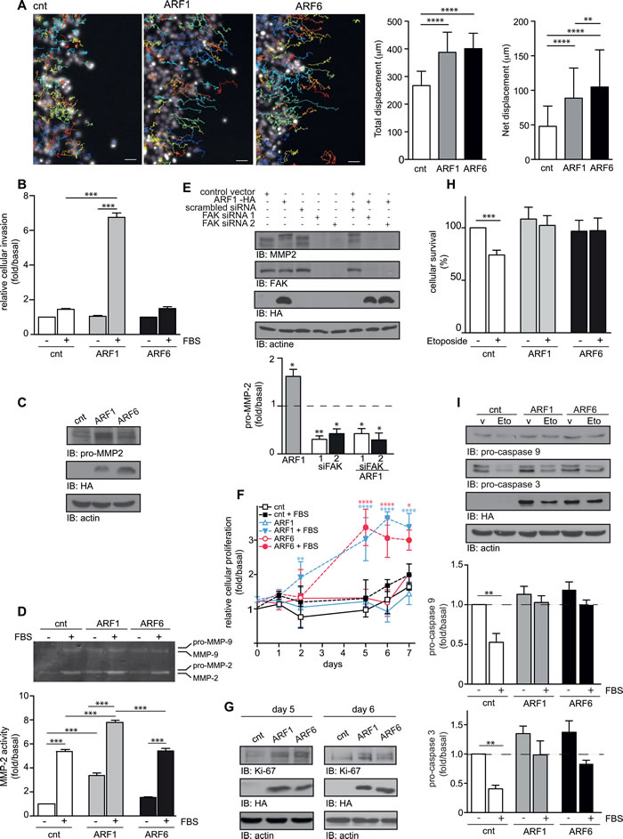 Figure 6: Overexpression of ARF controls motility, invasion, proliferation, and survival of MCF7 cells. A. MCF7 were transfected with empty vector (cnt), or ARF1 or ARF6. After 48h, confluent cells were scratch and wound healing was monitored over 16h in the presence FBS. Hoechst-stained nuclei were tracked using Fiji software. Representative pictures of cells tracking over 16h are shown. Scale bars, 50 µm. Quantification of cell motility: right graphs represent the mean total and net displacement. n = 120-150 cells. **p < 0.001,****p < 0.0005. B. Cells transfected as in A, were seeded into Matrigel-coated Boyden chambers. Cells were left untreated or stimulated with FBS 10% for 16 hours. Graph is representative of three images taken, per condition, of three independent experiments. C. Protein expression of pro-MMP2, HA-tagged protein and actin were detected by Western immunoblotting. D. Transfected cells were stimulated or not for 12 hours with 10% FBS. Supernatants were collected and analyzed by zymography. Data are the mean ± SEM of three experiments. E. Cells were transfected with either empty vector, HA-ARF1, scrambled or two different FAK siRNA. Protein expression of pro-MMP2, FAK, HA-tagged protein and actin were detected by Western immunoblotting. Graph represents the mean ± SEM of five experiments. Significance was measured by one-way ANOVA followed by Bonferroni’s multiple comparison tests. *p < 0.05, **p < 0.01. F. MCF7 cells transfected as in A, were seeded in 96-well plates. Proliferation was measured by MTT (Thiazolyl blue-tetrazolium-bromide) over 7 days. These experiments are representative of four performed in triplicate. G. Endogenous expression of Ki-67, ARF6 and actin was detected by Western immunoblotting, after 5 and 4 days. H. Cells were transfected as in A. and 24 hours after the transfection, they were treated with vehicle or etoposide. After 48 hours, surviving cells were analyzed by FACS, using Annexin-V binding and PI permeability assays. Data are the mean ± SEM of three experiments respectively. I. Transfected cells treated as in H. and level of pro-caspase 9, pro-caspase 3, actin and HA-tagged protein were detected by Western immunoblotting. Data are the mean ± SEM of three experiments. In D., H. and I., significance was assessed by two-way ANOVA followed by Bonferroni’s multiple comparison test. *p < 0.05, **p < 0.01, ***p < 0.001.