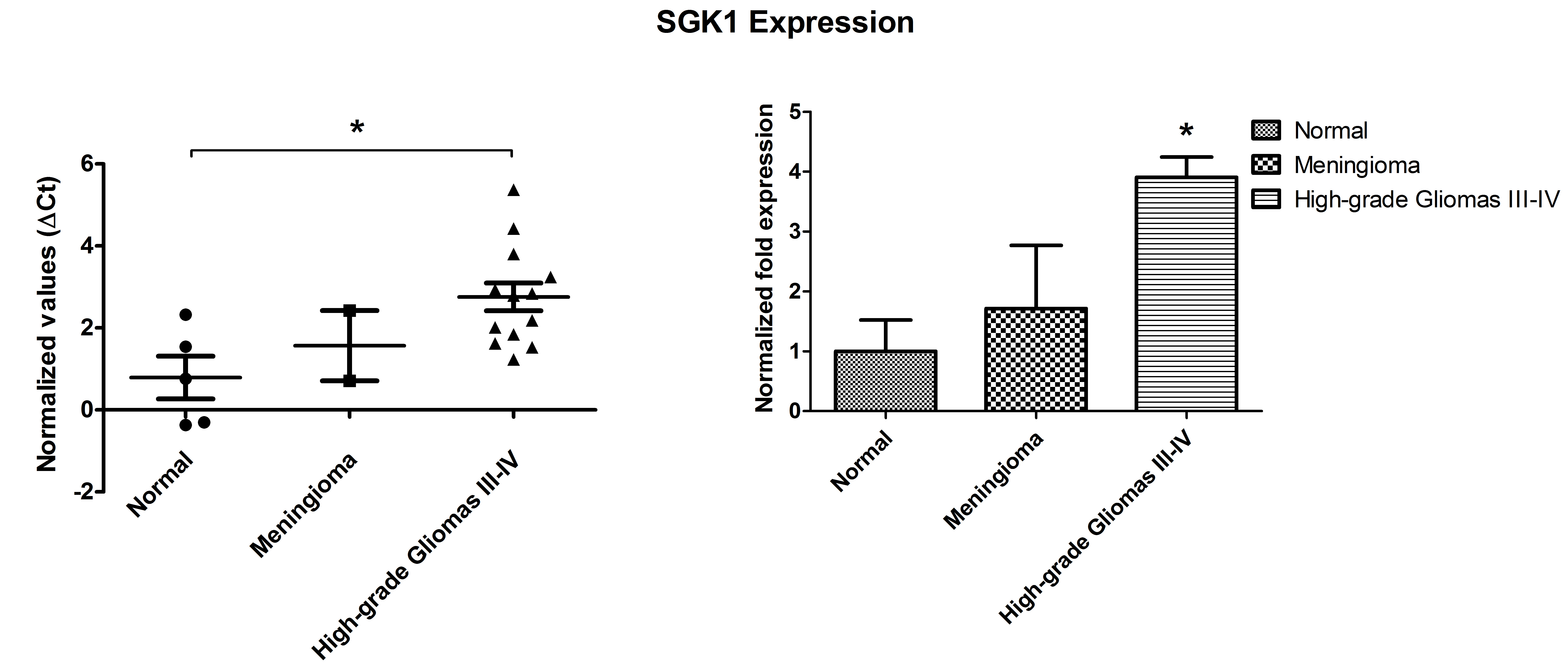 Figure 1: qPCR-based evaluation of SGK1 mRNA expression in brain tumors (glioblastoma multiforme and meningioma) compared with normal brain tissue. Graphs (M+/- SE) represent the ∆CT distribution (left panel) and the fold increase values (right panel). Statistical significance (P = 0.01) has been calculated as detailed in the Methods section. *P ≤ 0.05; **P ≤ 0.01; ***P ≤ 0.001.