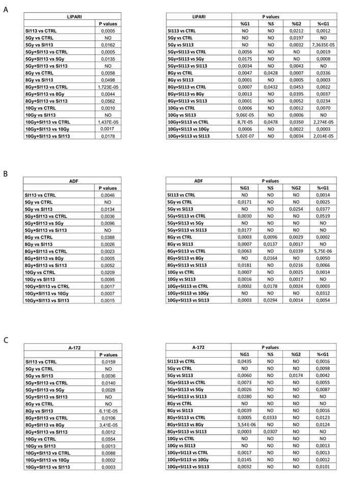 Figure 3: SI113 potentiates the effects of ionizing radiations in LI, ADF and A172 cells. The bar graphs (Top Panels) represent the total number of cells treated with increasing dose of RT (5, 8, 10 Gy) in the presence or absence of SI113 (12.5μM) for 72 h. Results are expressed as the mean ± SE of six independent experiments for each cell line. The bar graphs (Bottom Panels) represent the cell cycle distribution of cells treated with increasing dose of RT (5, 8, 10 Gy) in the presence or absence of SI113 (12.5μM) for 72 h. Cells were analyzed by cytofluorimetry after staining with Guava Cell Cycle reagent. A. LI cell line, B. ADF cell line and C. A172 cell line. Statistical significances are reported in the tables under each graph. *P ≤ 0.05; **P ≤ 0.01; ***P ≤ 0.001.