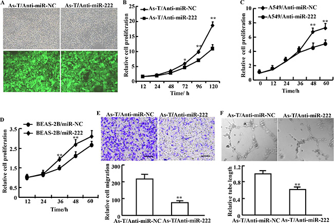 Figure 2: Treatment of cells using anti-miR-222 inhibitor decreases cell proliferation, migration, and tube formation. (A) As-T cells were infected with lentivirus carrying anti-miR-222 inhibitor and GFP or a negative control and GFP according to the manufacturer’s instruction. The cells with green fluorescence represent stably overexpressing miR-222 inhibitor (As-T/Anti-miR-222) or negative control As-T/Anti-miR-NC. (B) The CCK-8 assay was performed according to the manufacturer’s instruction to analyze proliferation of As-T cells expressing anti-miR-222 inhibitor (As-T/Anti-miR-222) or negative control (As-T/Anti-miR-NC). Proliferation rates were determined at 12, 24, 48, 72, 96, and 120 h after the seeding. (C, D) Similar experiments as above were performed in A549 cells (C), and in BEAS-2B cells (D) at 12, 24, 48 and 60 h. (E) Migration of As-T cells overexpressing anti-miR-222 inhibitor (As-T/anti-miR-222) or negative control (As-T/miR-NC) using Transwell assay. (F) As-T cells at 90% confluence stably overexpressing anti-miR-NC or anti-miR-222 inhibitor were cultured in 4 mL serum–reduced medium (1% FBS) in a 10 cm dish for 24 h, then the conditioned medium was collected for tube formation assay using HUVECs as we previously described. Data are represented as mean ± SE from five replicates from each treatment. * and ** indicate significant difference compared to the control (P < 0.05 and P < 0.01, respectively). Scale bar: 500 μm. Magnification: ×400. Scale bar: 50 μm.
