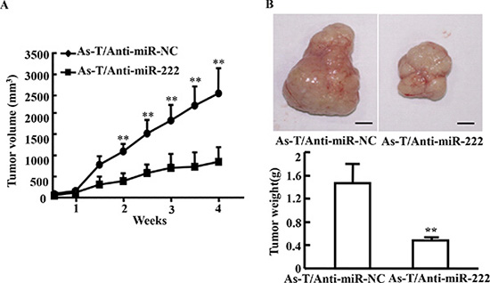 Figure 3: Expression of anti-miR-222 inhibitor in cells decreases As-T cells-induced tumor growth in vivo. (A) BALB/c nude mice (5–6 week old) were subcutaneously injected with 5 × 106 As-T cells expressing anti-miR-NC or anti-miR-222 inhibitor. Sizes of tumors were measured two times every week after they were visible. Volumes of tumors were calculated using the formula 0.5 × length × width2 [18]. (B) The tumors were resected and weighed after 28 days of the cell injection. Data were presented as mean ± SD. **indicates significant difference at P < 0.01.