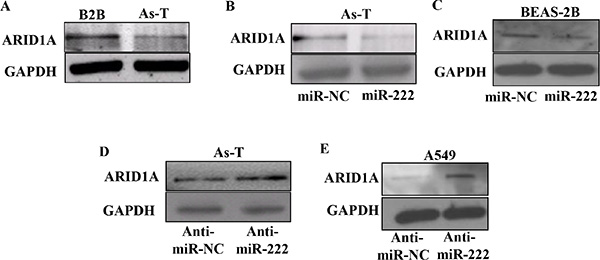 Figure 6: MiR-222 treatment inhibits ARID1A protein expression. (A) Total proteins from As-T and B2B cells were used to determine protein levels of ARID1A using Western blotting. (B) As-T cells and (C) BEAS-2B cells were transfected using miR-NC or miR-222 mimic, and the expression levels of ARID1A protein in the cells were detected using Western blotting 48 h after the transfection. (D) As-T cells and (E) A549 cells were transfected using anti-miR-NC or anti-miR-222 inhibitor, and analyzed as above.