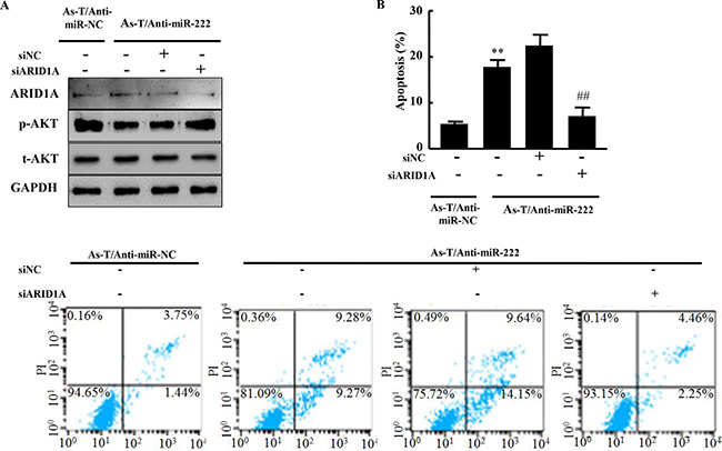 Figure 7: Anti-miR-222 inhibitor treatment inhibits AKT activation and induces apoptosis through ARID1A expression. (A) As-T/anti-miR-NC, As-T/anti-miR-222 cells, and As-T/anti-miR-222 cells transfected with ARID1A siRNAs or negative control siRNA were cultured for 48 h, and analyzed using specific antibodies as indicated. (B) These cells were also analyzed for apoptosis using flow cytometry (FACSCanto II, BD Biosciences) and FlowJo software. The data were from three different experiments in triplicate. **indicates significant difference compared to cells without miR-222 overexpression and ARID1A knockdown. ## indicates significant difference compared to ARID1A knockdown in miR-222 overexpressing cells.