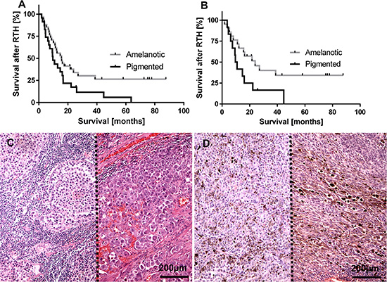 Figure 1: Survival time after radiotherapy (RTH) of all melanoma patients included into this study (A), n = 57; χ2= 4.62, p = 0.03) and melanoma patients received only RTH treatment (B), n = 33; χ2= 4.33, p = 0.04) subgrouped according melanin level in melanoma metastases. Representative lymph node melanoma metastases evaluated as amelanotic (C), two cases separated with dotted line) and pigmented (D) two cases separated with dotted line).