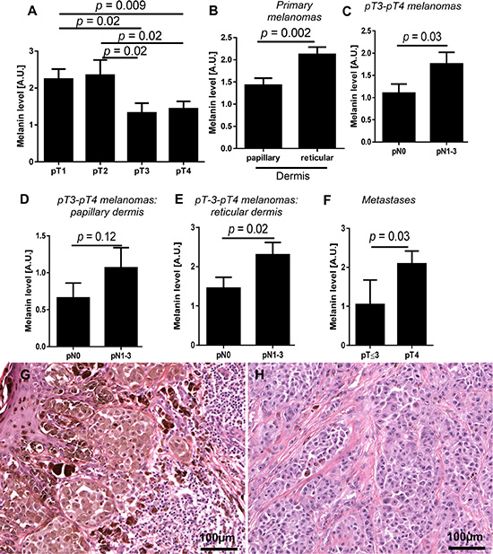 Figure 2: Mean melanin level in primary melanomas in relation to pT status (A) n = 84), localization of melanoma cells in the skin (B) n = 84) and pN status in pT3-pT4 melanomas (C). Melanin level in melanoma cells localized within papillary (D) and reticular dermis (E) of non-metastasizing (pN0) and metastasizing (pN1-3) pT3-4 melanomas (n = 45). Melanin level in metastases developed in pT2-3 and pT4 melanomas (F). Representative pT1 (G) and pT4 (H) melanoma cases. The p values represent statistical significance in Mann-Whitney test.