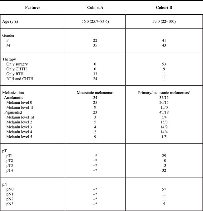 Two cohorts of melanoma patients that were diagnosed and treated at the Oncology Center in Bydgoszcz, Poland were analyzed in relation to the clinicopathological characteristics listed in Table 2. Cohort A represented 57 patients with melanized and amelanotic metastatic melanomas that were confirmed histologically, and who received radiotherapy. Thirty-three patients received only radiotherapy, while 24 received both RTH and CHTH (Table 2, column Cohort A). The metastatic melanomas in 48 out of 57 patients were removed by surgery just before RTH. In 7 patients metastatic tumors were resected 8–18 months before RTH. These patients received CHTH followed by RTH. In 2 patients, RTH followed diagnosis of metastatic tumors by core biopsy.