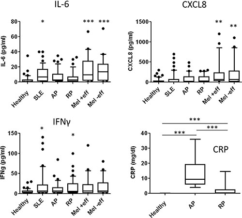 We studied the expression of inflammatory cytokines including IL-6, CXCL8 and IFNγ. In line with previous reports [26], the serum levels of IL-6 and CXCL8 were not significantly elevated among AP and RP patients, as opposed to higher levels observed in metastatic melanoma patients, similar to previously reports [27, 28] (Figure 1). Serum levels of IFNγ were somewhat higher in all of the different patient groups, but statistical significance was demonstrated only among the SLE and RP patients (Figure 1). There were no significant differences between melanoma patients with or without pericardial effusion (Figure 1). As expected, the highest CRP level was observed among the AP patients, but also significantly higher levels than in healthy donors were observed in the RP patients (Figure 1). There were no differences in inflammatory cytokine levels among males and females (data not shown).