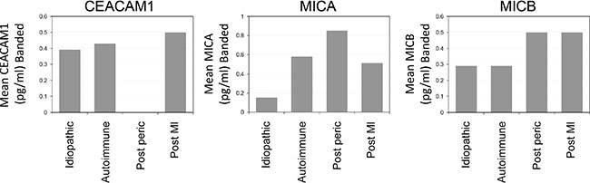 As previous reports failed to associate the inflammatory cytokines, which probably emanate from innate immunity components, with certain etiologies or with prognostic parameters, we decided to focus on other novel serum markers, CEACAM1, MICA and MICB. These proteins probably emanate from the injured tissue and have immune regulatory functions, as detailed in the introduction, and therefore might provide new insights on pericardial diseases.