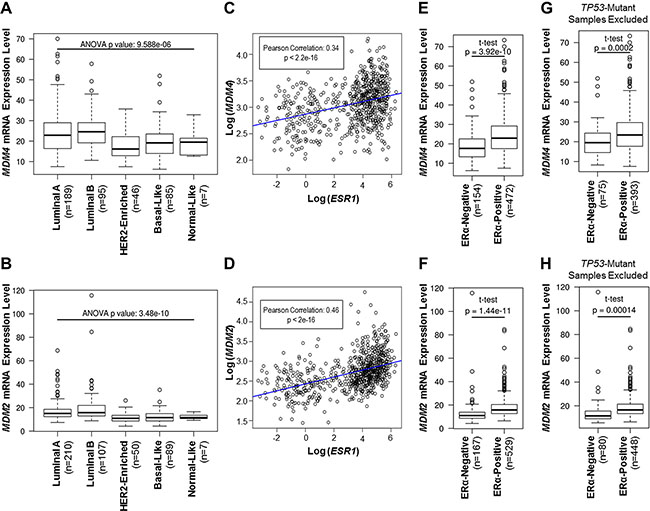 Figure 1: MDM4 and MDM2 mRNA expression is elevated in ERα-positive primary breast invasive carcinoma samples. (A–H) Analyses of MDM4 or MDM2 mRNA expression in TCGA breast invasive carcinoma cohort. (A, B) Tumor types are classified according to the PAM50 model of intrinsic subtype classification. (C, D) Pearson product-moment correlation coefficient test analysis of correlations between ESR1/ERα mRNA and either MDM4 mRNA (panel C) or MDM2 mRNA (panel D). (E, F) Tumor types are classified according to ERα status. (G, H) As in panels E and F, but TP53-mutant tumors were excluded from the analysis to study gene expression patterns that were independent of TP53 mutations. Note that for panels A, C, E and G, samples with MDM4 gene amplifications were excluded from the analysis to study patterns in MDM4 mRNA expression that were independent of MDM4 gene amplification. For panels B, D, F and H, samples with MDM2 gene amplifications were excluded from the analysis to study patterns in MDM2 mRNA expression that were independent of MDM2 gene amplification.