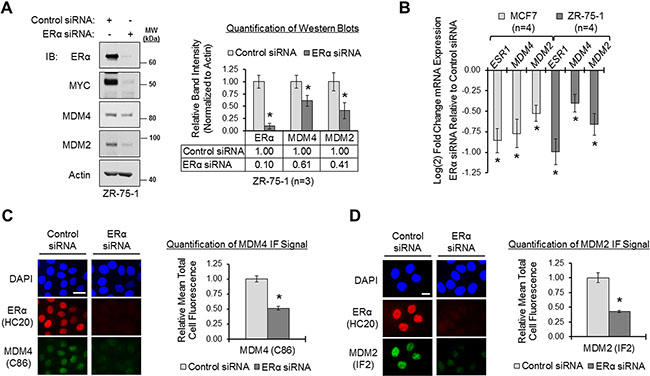 Since ERα-positive primary invasive breast carcinomas have elevated expression of MDM4 and MDM2 genes, we hypothesized that ERα mediates the upregulation of MDM4 and MDM2 in human breast cancer. Previous reports have proposed that ERα modulates MDM2 expression [38, 50, 61, 62, 64–68]. However, it is not known if ERα also regulates MDM4 expression. We used the luminal human breast adenocarcinoma cell lines ZR-75-1 and MCF7 as in vitro model systems of ERα-positive breast cancer, and we investigated how loss of ERα expression affected MDM4 gene expression at the protein and mRNA levels, as compared to its effects on MDM2 gene expression. As shown in Figure 2, panel A, we used ERα siRNA to efficiently knock down ERα expression by approximately 90% in ZR-75-1 cells, which resulted in the decreased expression of MYC, a well-characterized ERα-target gene [78, 79] shown here as a positive control. Notably, when ERα was knocked down, we also observed significant reductions in MDM4 and MDM2 protein expression, by approximately 40% and 60%, respectively, demonstrating that ERα positively regulates the expression of both MDM4 and MDM2 (Figure 2A). Substantial decreases in MDM4 and MDM2 protein expression were also observed using a second ERα siRNA and a second cell line, MCF7, demonstrating the specificity of the effect (Supplementary Figure S2, panel A). qPCR analysis of MDM4 and MDM2 mRNA expression in MCF7 and ZR-75-1 cells that had been transfected with ERα siRNA or non-silencing control siRNA revealed that loss of ERα also resulted in a significant downregulation of MDM4 and MDM2 mRNA expression (Figure 2B). This finding is in agreement with our data from Figure 1, where we observed that ERα expression positively correlated with MDM4 and MDM2 mRNA expression in primary breast carcinomas. Therefore, we conclude that ERα is a positive regulator of not only MDM2 gene expression, but also of MDM4 gene expression.