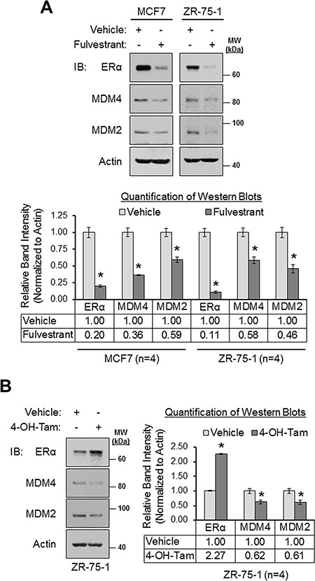 Figure 3: Pharmacologic inhibition of ERα results in the downregulation MDM4 and MDM2 in breast cancer cells. (A) Western blot analysis of MCF7 and ZR-75-1 cells that were treated with vehicle (ethanol) or fulvestrant (1 μM) for 24 h. Upper panel: representative western blots. Lower panel: quantification of western blots (n = 4). (B) Western blot analysis of ZR-75-1 cells that were treated with vehicle (ethanol) or 4-hydroxytamoxifen (1 μM) for 24 h. Left panel: representative western blot. Right panel: quantification of western blots (n = 4). Error bars = SEM of biological replicates. *p < 0.05, unpaired t-test. 4-OH-Tam = 4-hydroxytamoxifen. IB = immunoblot. kDa = kilodaltons. MW = molecular weight.