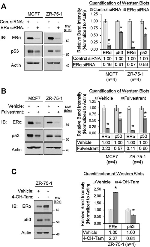 Figure 4: Loss of and/or inhibition of ERα downregulates p53 expression. (A) Western blot analysis of MCF7 and ZR-75-1 cells that were transfected with control siRNA or ERα siRNA for 22 h. Left panel: representative western blot. Right panel: quantification of western blots (n = 4). (B) Western blot analysis of MCF7 and ZR-75-1 cells that were treated with vehicle (ethanol) or fulvestrant (1 μM) for 24 h. Left panel: representative western blot. Right panel: quantification of western blots (n = 4). (C) Western blot analysis of ZR-75-1 cells that were treated with vehicle (ethanol) or 4-hydroxytamoxifen (1 μM) for 24 h. Left panel: representative western blot. Right panel: quantification of western blots (n = 4). Error bars = SEM of biological replicates. *p < 0.05, unpaired t-test. 4-OH-Tam = 4-hydroxytamoxifen. Con. = control. IB = immunoblot. kDa = kilodaltons. MW = molecular weight.