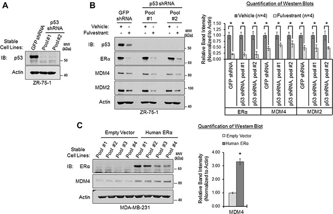 Figure 5: ERα modulates MDM4 expression via p53-independent mechanisms. (A) Western blot analysis of ZR-75-1 cells that stably overexpress GFP shRNA or p53 shRNA (two different cell pools). (B) Western blot analysis of cells from panel A that were treated with vehicle (ethanol) or fulvestrant (1 μM) for 22 h. Left: representative western blot. Right: Quantification of western blots (n = 4). Error bars = SEM of biological replicates. (C) Western blot analysis of p53-mutant MDA-MB-231 cells that stably overexpress human ERα cDNA or an empty vector. Left: western blot. Right: quantification of western blot. Error bars = SEM of 4 different cell pools for each condition. *p < 0.05, unpaired t-test. IB = immunoblot. kDa = kilodaltons. MW = molecular weight.