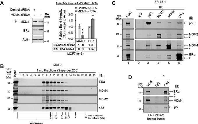Figure 6: MDM4 and MDM2 negatively regulate ERα expression and form a protein complex with ERα. (A) Western blot analysis of MCF7 cells that had been transfected with control siRNA or MDM4 siRNA for 48 h. Left panel: representative western blot. Right panel: quantification of western blots (n = 3). Error bars = SEM of biological replicates. *p < 0.05, unpaired t-test. (B) Western blot analysis of MCF7 lysates that were subjected to size exclusion column chromatography gel filtration. The fraction numbers are labeled above the blot. The molecular weight markers for column fractionation are labeled below the blot. The molecular weight markers for SDS-PAGE are labeled to the right of the blot. (C) Co-immunoprecipitation (co-IP) analysis of protein complexes in ZR-75-1 lysates. Immunoprecipitation (IP) was performed with normal IgG, p53 antibody, MDM2 antibody, MDM4 antibody or ERα antibody, as labeled above the blot. Immunoblot (IB) detection was performed using p53, MDM2, MDM4, or ERα antibodies, as labeled to the right of the blot. IgG is shown as a negative control. Interactions between p53-MDM2, p53-MDM4 and p53-ERα are shown as positive controls. (D) Co-IP analysis of protein complexes in lysate from a primary ERα-positive patient breast tumor sample. IP was performed with normal IgG or ERα antibody, as labeled above the blot. IB detection was performed using ERα, MDM4 or p53 antibodies, as labeled to the right of the blot. IgG is shown as a negative control. Interaction between p53-ERα is shown as a positive control. # = related isoform, protein fragment, or non-specific band. IB = immunoblot. IgG = immunoglobulin G. IP = immunoprecipitation. kDa = kilodaltons. MW = molecular weight.