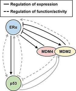 In conclusion, we have herein demonstrated that ERα expression associates with MDM4 and MDM2 gene expression in primary breast invasive carcinoma samples. Our in vitro analyses of human breast cancer cells reveal that ERα positively regulates MDM4 and MDM2 expression via p53-independent mechanisms, while MDM4 and MDM2 negatively regulate ERα expression. In addition, ERα forms a protein complex with MDM4, MDM2 and p53, suggesting direct signaling crosstalk amongst these four proteins. Future studies are needed to ascertain the intricate mechanisms which govern signaling crosstalk between ERα, MDM4 and MDM2, and to delineate the physiological relevance of such crosstalk in terms of p53 and ERα biology, breast tumorigenesis, and therapeutic response.