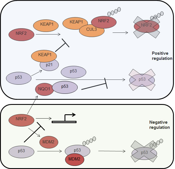 Figure 2: Positive and negative (up or down) co-regulation between p53 and NRF2. Top to bottom. KEAP1 interacts with NRF2 and forms a complex with the E3 ligase CUL3 that results in NRF2 ubiquitylation and degradation by the proteasome (depicted as a blue X). The p53 target gene, p21, interacts with KEAP1 and inhibits NRF2 ubiquitylation and degradation. p53 is degraded by the proteasome in a ubiquitin n dependent manner. The NFR2 target, NQO1, interacts with p53 and protects it from degradation. NRF2 target gene, MDM2, promotes p53 ubiquitylation and degradation by the proteasome. P53 is a transcriptional repressor of NRF2. NRF2, nuclear factor (erythroid-derived 2)-like 2NQO1, NAD(P)H quinine dehydrogenase; mdm2, mouse double minute 2.