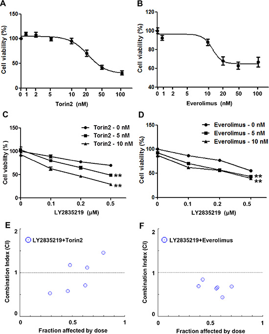 Figure 4: Combined effect of LY2835219 and mTOR inhibitors in vitro. (A and B) Sensitivity of OSC-19 cells to torin2 (A) and everolimus (B). (C and D) Cell viability of OSC-19 cells treated with LY2835219 and torin2 (C) and LY2835219 and everolimus (D). Data represent the mean of six replicates. E and F. Combination index plot of LY2835219 and torin2 (E) and LY2835219 and everolimus (F) Combination index values that are less than 1 indicated synergistic interactions Data are representative of three independent experiments: mean ± SEM. **P < 0.01.