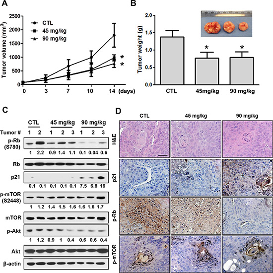 Figure 5: Antitumor activity of LY2835219 in HNSCC xenograft tumor model. (A) Mice bearing subcutaneous OSC-19 tumors were dosed with vehicle (n = 4), 45 mg/kg (n = 5), or 90 mg/kg (n = 5) LY2835219 once daily for 14 days. Tumor size was measured by caliper twice weekly. (B) Tumor weight. Data represent mean volume ± SEM. *P < 0.05; **P < 0.01; compared with respective control group treated with vehicle. (C) OSC-19 tumors were collected at the end of experiments. Tumor lysates were prepared and analyzed by immunoblotting using the indicated antibodies. Relative band intensity values are indicated. (D) Representative examples of immunohistochemical staining for hematoxylin and eosin (H & E), p21, p-Rb, and p-mTOR in OSC-19 tumor xenografts. Original magnification, x200. Scale bar, 50 μm.