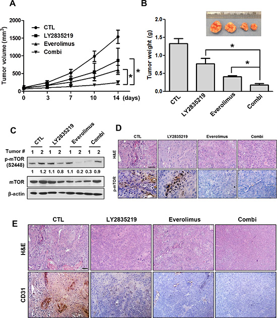 Figure 6: LY2835219 and mTOR inhibitor combination in HNSCC xenograft tumor model. (A) Mice bearing subcutaneous OSC-19 tumors were dosed with vehicle (n =4), 45 mg/kg (n = 5), 5 mg/kg everolimus (n = 5), or LY2835219 plus everolimus combination (n = 5) once daily for 14 days. Tumor size was measured by caliper twice weekly. (B) Tumor weight. Data represent mean volume ± SEM. *P < 0.05; **P < 0.01; compared with either LY2835219 or everolimus alone group. (C) OSC-19 tumors were collected at the end of the experiment. Tumor lysates were prepared and analyzed by immunoblotting using p-mTOR, mTOR, and β-actin. Relative band intensity values are indicated. (D) Representative images of immunohistochemical staining for H & E and p-mTOR. (E) Immunohistochemical staining of CD31, an endothelial cell-specific surface marker, in OSC-19 tumor xenografts. Original magnification, x200. Scale bar, 50 μm.
