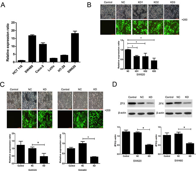 Figure 2: Analysis of ZFX expression and its lentivirus mediated shRNA knockdown. (A) RT-PCR analysis of ZFX mRNA expression in two CRC cell lines. (B) The transfection and knockdown efficiency of each lentivirus shRNA (KD1, KD2 and KD3) in SW620 cells as evaluated using fluorescence microscopy and RT-PCR (bottom panel), respectively. (C) RT-PCR analysis confirming the transfection and knockdown efficiencies (bottom panel) of KD3 lentivirus shRNA in SW620 and SW480 cells. (D) Western blots confirming the knockdown efficiency of KD3 shRNA in SW620 and SW480 cells. *P < 0.05.