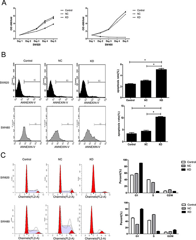 Figure 3: Effect of ZFX knockdown on cell proliferation, apoptosis and cell cycle in CRC cells. (A) ZFX knockdown inhibited the proliferation of SW620 and SW480 cells (p < 0.05), as analyzed by MTT assay. (B) ZFX knockdown increased the incidence of apoptosis among SW620 and SW480 cells (p < 0.05). (C) ZFX knockdown arrested SW620 and SW480 cells in G1 phase (p < 0.05). C, no infection; NC, negative control shRNA; and KD, ZFX shRNA (KD3).