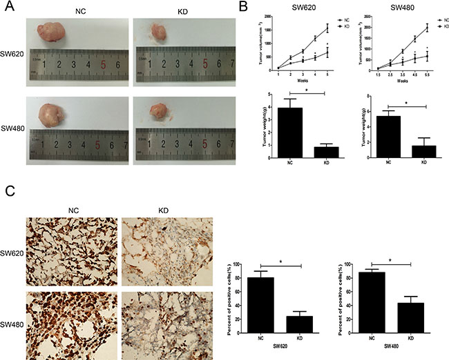 Figure 5: Effect of ZFX knockdown on the growth of CRC cell xenografts. (A) Representative images of harvested tumors from nude mice subcutaneously injected with NC or ZFX KD SW620 and SW480 cells. Tumor sizes were decreased after ZFX knockdown. (B) Tumor volumes (upper panel) and weights (lower panel) were decreased after ZFX knockdown (p < 0.05). (C) Representative immunostaining of the Ki-67 proliferation marker in NC and ZFX KD tumors (left panel, 400× magnification). Numbers of Ki-67 positive cells were reduced in ZFX KD tumors (right panel) (p < 0.05).