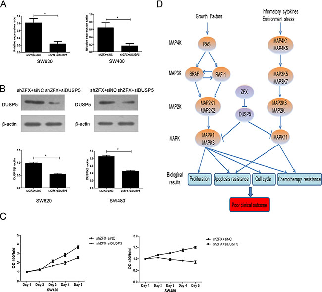 The information in the Reactome and Oncomine databases suggest FOSL1 likely acts as an oncogene that activates the MAPK pathway (data not shown). However, That is not consistent with our finding that ZFX knockdown resulted in upregulation of FOSl1 gene. We therefore proposed that DUSP5 is the dominant target of ZFX in SW620 and SW480 cells. To determine whether DUSP5 downregulation could rescue the growth-suppressive effects of ZFX knockdown, we used siRNA to ablate DUSP5 in ZFX-KD SW620 and SW480 cells (Figure 7A–7B). Then using MTT assays we showed that DUSP5 downregulation rescued the ZFX-mediated suppression in cell proliferation (Figure 7C). Based on these results and our microarray analysis, we proposed a putative working model depicting the tentative mechanism by which ZFX stimulates CRC malignant progression leading to a poor prognosis (Figure 7D). It appears that ZFX expression downregulates DUSP5, which sustains RAS- or MAP4K1/5-induced activation of the MAPK pathway involving MAPK1, MAPK3 and MAPK11. This ultimately results in the induction of oncogenic signaling with unfavorable clinical outcomes.
