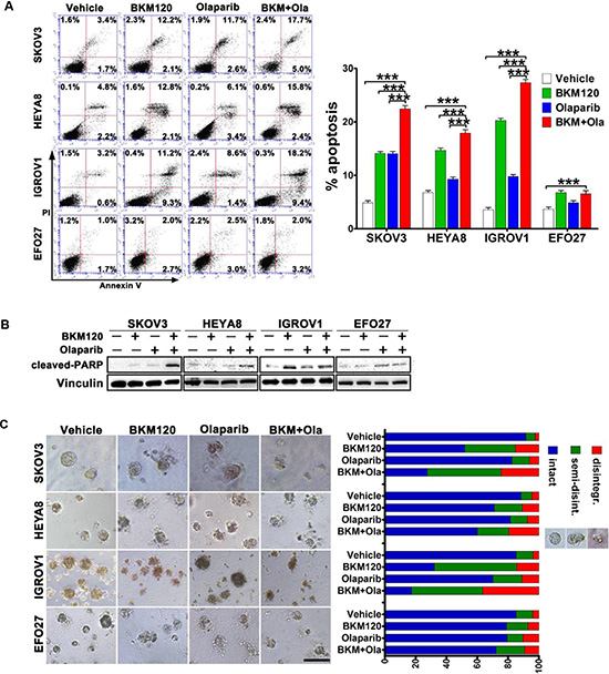Figure 2: Effects of BKM120 and Olaparib as single-agents and in combination on the survival of ovarian cancer cells. (A) Ovarian cancer cells were treated by BKM120 and Olaparib, each alone or in combination, for 48 hours. The percentage of apoptotic cells was determined by Annexin V and PI staining. Mean ± S.D. for three independent experiments are shown. ***P < 0.001 (Student’s t test) (B) Western blot analysis of cleaved-PARP in ovarian cancer cells treated as indicated for 48 hours. Vinculin was used as a loading control. (C) Ovarian cancer cells as indicated were grown in 3D and treated with indicated drugs and quantitated for structural integrity after 72 hours drug treatment as described in Methods. Representative images of scored structures (intact, semi-disintegrated, disintegrated) are shown in right panel, scale bar 200 μm.