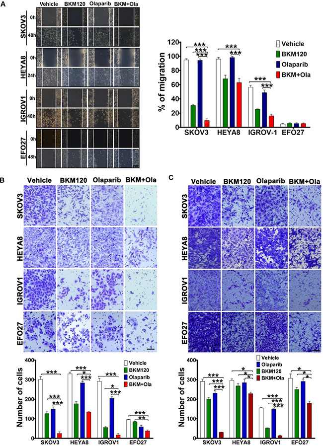 Figure 3: Effects of BKM120 and Olaparib as single-agents and in combination on migration and invasion of ovarian cancer cells. (A) Cell migration potential was determined using a wound-healing assay. Images of the wound areas were shown at 0 and 24 h (HEYA8) or 48 h (SKOV3, IGROV1 and EFO27) (at magnification × 100, scale bar 200 μm). Mean ± S.D. for three independent experiments are shown. (B) Migration of ovarian cancer cells with the inhibitor treatment as indicated was assessed using Boyden chamber assay. Migrated cells on the underside of the filter were photographed and counted by phase contrast microscopy (at magnification × 200, scale bar 100 μm). Mean ± S.D. for three independent experiments are shown. (C) Ovarian cancer cells were subjected to a Matrigel invasion assay in the presence of inhibitor treatment as indicated. For each experiment, cell number was calculated as the total count from 10 random fields per filter (at magnification × 200, scale bar 100 μm). Mean ± S.D. for three independent experiments are shown. *P < 0.05; **P < 0.01; ***P < 0.001 (Student’s t test).
