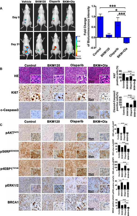 Figure 6: Bioluminescence imaging of SKOV3-Luc tumor response to BKM120 and Olaparib as single-agents and in combination. SKOV3-Luc cells were injected into immunodeficient NOD/SCID mice via intraperitoneal injection. (A) Representative bioluminescence imaging of mice bearing intraperitoneally disseminated SKOV3-Luc tumors before (Day 0, baseline) and after inhibitor treatment as indicated for 21 days were shown. Fold change of bioluminescence intensity over baseline level was calculated and data were shown as mean ± S.E.M. (n = 6/treatment group). *P < 0.05; **P < 0.01; ***P < 0.001 (Student’s t test). (B) Representative images for hematoxylin and eosin (H & E) staining and immunohistochemical staining analyses of Ki67 and cleaved-caspase 3 on SKOV3-Luc tumors isolated from mice treatment with either single-agents or the combination. (C) Representative images for immunohistochemical staining analyses of protein as indicated on the same tumor samples as in B. Scale bars, 50 μm.