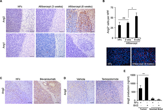 Figure 1: Anti-VEGF therapy-induced invasive tumor phenotype is associated with increased Ang2 expression. (A) Sections of U87MG-derived tumors from mice treated with aflibercept for 3 weeks or 6 weeks or with control treatment (hFc) were stained for Ang2 and Ang1 expression. Invasive features and increased Ang2 were observed in animals treated with aflibercept for 6 weeks. Scale bars = 50 μm. (B) Quantification (top) of Ang2+ cells in tumors from animals treated with aflibercept (3 or 6 weeks) or control. Data are presented as mean ± SD. Representative images (bottom) show merged fluorescent Ang2 (red) and DAPI (blue). HPF, high-power field. ns, P > 0.05; *P < 0.05. (C, D) Tumor sections from mice treated with bevacizumab (C), temozolomide (D), or controls were stained for Ang2 expression. Scale bars = 50 μm. (E) Quantification by enzyme-linked immunosorbent assay of Ang2 production in tumor lysates from U87MG-derived intracranial xenografts after treatment with bevacizumab or control (hFc) compared with Ang2 present in normal brain tissue lysates. Data are presented as mean ± SD. BVZ, bevacizumab. **P < 0.01.