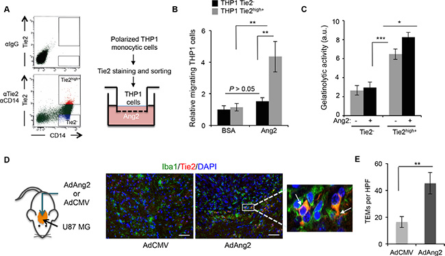 Figure 2: Ang2 is an attractant signal for TEMs in vitro and in vivo. (A) THP-1 monocytic cells were exposed to IL-4, IL-13, and hypoxia and sorted as Tie2− and Tie2high+ (left panel). Their migratory properties towards Ang2 or vehicle (BSA) were measured using a modified Boyden chamber as depicted (right panel). (B) Data from experiment described in (A) are presented as relative mean ± SD number of migrating THP-1 cells per microscopic field (200x). ns, P > 0.05; **P < 0.01. (C) Quantification of gelatinolytic activity present in conditioned medium, containing Ang2 or vehicle, of sorted CD14+Tie2− and CD14+Tie2high+ cells. Data are presented as mean ± SD. au, arbitrary units. *P < 0.05; ***P < 0.001. (D) Brains of athymic mice bearing intracranial U87MG-derived tumors, treated with intratumoral delivery of an adenoviral vector expressing Ang2 (AdAng2) or a control vector (AdCMV), were analyzed for Iba1 (green) and Tie2 (red) expression. DAPI was used for nuclear staining (blue). White arrows indicate the presence of Iba1+Tie2+ cells. Scale bars = 20 μm. (E) Quantification of TEMs, defined as Iba1+Tie2+ cells, in surgical U87MG-derived xenografts treated intratumorally with AdCMV or AdAng2. Data are presented as mean ± SD. HPF, high-power field. **P < 0.01.