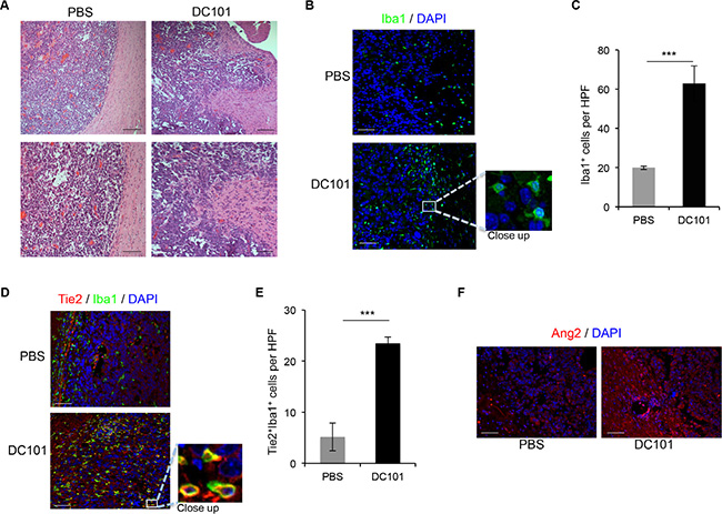 Figure 3: DC101 treatment increased Ang2 levels, TEM recruitment, and invasive glioma outgrowth. (A) DC101 treatment induced invasive tumor outgrowth in the GL261 syngeneic model. Tumor sections from mice treated with DC101 or vehicle were stained with hematoxylin and eosin. Scale bars = 200 μm (top) and 50 μm (bottom). (B) Representative images of Iba1 immunostaining of brain sections of GL261-bearing mice treated with DC101 or vehicle. DAPI was used for nuclear staining (blue). Scale bars = 50 μm. (C) Quantification of Iba1+ cells present in a high-power field (HPF) in brain tumors after DC101 treatment. Data are presented as mean ± SD. ***P < 0.001. (D) Representative images of Tie2 (red) and Iba1 (green) double immunofluorescence in sections from GL261 syngeneic tumors treated with DC101 or vehicle. DAPI was used for nuclear staining (blue). Scale bars = 50 μm. (E) Quantification of TEMs (Tie2+Iba1+ cells) present in a HPF after DC101 treatment. Data are presented as mean ± SD. (F) Representative images of Ang2 immunofluorescence in sections from orthotopic GL261-derived gliomas after DC101 treatment. Scale bars = 50 μm. ***P < 0.001.