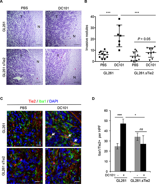 Figure 4: Soluble Tie2 expression counters the pro-invasive phenotype upon anti-VEGF therapy. (A) GL261- and GL261. sTie2-derived tumor sections from mice treated with DC101 or vehicle were stained with hematoxylin and eosin. Invasive features were observed in Gl261-bearing mice treated with DC101 but not in GL261.sTie2bearing mice treated with DC101. Scale bars = 20 μm. N, normal brain; T, tumor. (B) Quantification of invasive nodules present in intracranial syngeneic tumors after DC101 treatment. GL261 and GL261.sTie2 were tested. Data are presented as mean ± SD. ***P < 0.001. (C) Representative images of Tie2 (red) and Iba1 (green) double immunofluorescence in sections from GL261 and GL261.sTie2 syngeneic tumors treated with DC101 or vehicle. DAPI was used for nuclear staining (blue). White arrows indicate the presence of Iba1+Tie2+ cells. Scale bars = 20 μm. (D) Quantification of TEMs (Tie2+Iba1+ cells) present in a high-power field (HPF) after DC101 treatment. Data are presented as mean ± SD. ns, P > 0.05; *P < 0.05; ***P < 0.001.