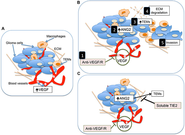 Figure 5: Proposed model describing the mechanisms underlying the heightened invasion of gliomas after anti-VEGF/R therapy and the role of soluble Tie2 in contrarresting this effect. (A) Simplified representation of the tumor microenvironment in malignant gliomas. Two of the major characteristics of these tumors is the presence of high levels of VEGF and their highly angiogenic component. (B) Treatment with anti-VEGF or anti-VEGFR therapies results in not only an antiangiogenic effect on the tumor [1] but also in increased levels of Ang2 [2] which is a major attractant of TEMs [3]. This monocytic subpopulation is responsible for the production of tumor remodeling proteins and the subsequent breakdown of the extracelullar matrix (ECM) [4] favoring tumor invasion [5]. (C) The concomitant use of soluble Tie2 with antiangiogenesis therapies should, among other functions, jeopardize the effect of Ang2 to attract TEMs, preventing the induction of the highly invasive phenotype of gliomas associated with the use of anti-angiogenic therapies.