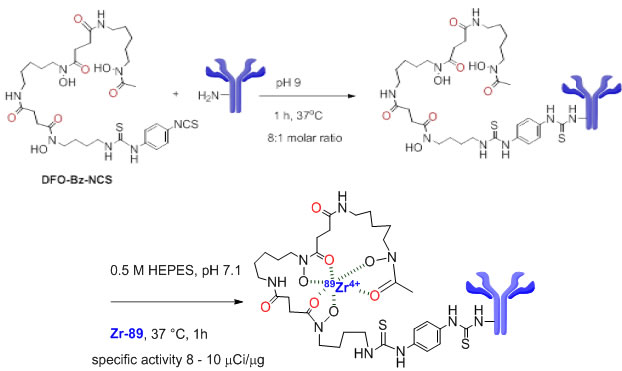 Figure 2: Ontuxizumab conjugation. Ontuxizumab was conjugated to p-isothiocyanatobenzyl-desferrioxamine (DFO-Bz-NCS metal chelate) via lysine residues. After purification, the antibody conjugate was radiolabeled with 89Zr-oxalate under neutral pH conditions.